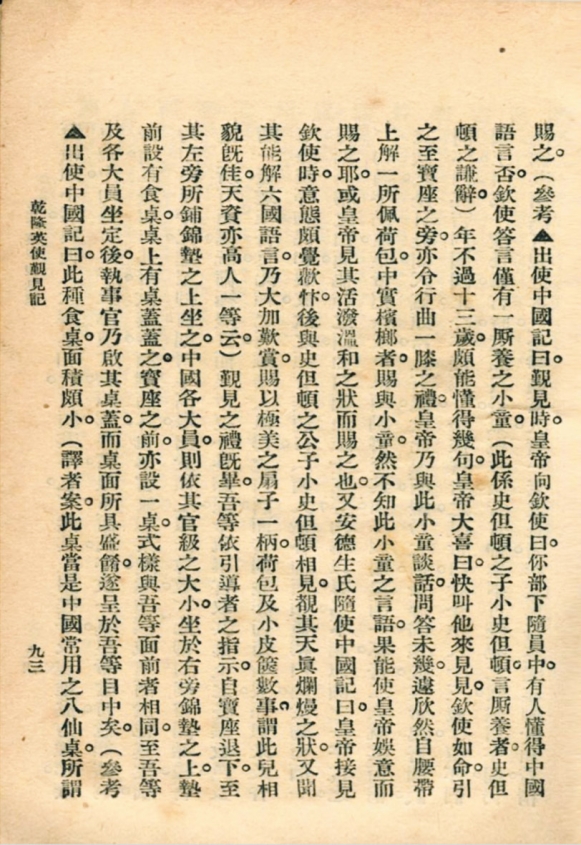 参考《出使中国记》曰:“觐见时,皇帝向钦使曰:你部下随员中有人懂得中国语言否?”钦使答言:“仅有一厮养之小童(此系史但顿之子小史但顿言,厮养者史但顿之谦辞),年不过十三岁,能懂得几句。”