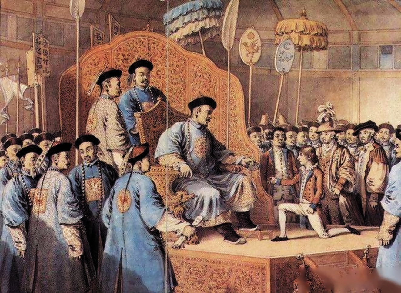 乾隆五十七年(1792年)9月26日,乔治·马戛尔尼率领使团以祝贺乾隆皇帝八十大寿为名出使中国,随员80余人,包括天文数学家、艺术家、医生,另有卫兵95名,由兵船护送。所携“贡品”约值13124英磅,内有天文、地理仪器、图书、毯毡、军用品、车辆、船式,总计600箱。次年8月5日,使团乘坐的一艘装备六十门炮舰的“狮子”号和两艘英国东印度公司提供的随行船只抵达天津白河口,之后换小船入大沽。进入天津,受到直隶总督梁肯堂的欢迎。8月9日,使团离大沽赴北京。9月2日,赴承德避暑山庄晋见乾隆帝。9月11日,马戛尔尼拜会相国和珅,重点协商觐见时用英礼还是用华礼的问题,并商谈觐见的具体时间和地点。马戛尔尼说:“至此,礼节上之争执已完全终结。乃议决本星期六,为吾觐见皇帝之期,由相国亲为引见。”9月13日,使团抵达热河,向中国政府代表和珅递交了国书,双方达成协议,英国作为独立国家,其使节行单膝下跪礼,不必叩头。