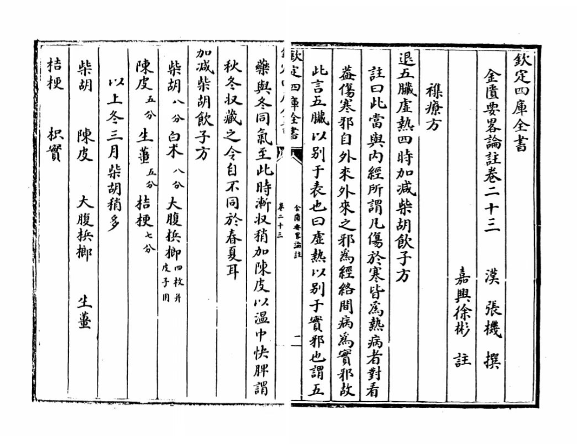《金匮要略论》分为两部:一部名 《伤寒论》,主要阐述霍乱、流行性感冒和肺炎等多种外感热病的辨证施治的原则和方法;另一部名 《金匮要略》,主要是阐述内科杂病,兼述外科、妇科及皮肤科等40多种疾病的辨证施治原则和方法,汇集了自己和前人成功的医疗经验。全书共收载济方375方,在卷二十三“杂疗方”之“退五脏虚热四时加减柴胡饮子方”中,着重论述了槟榔等药材的功能、药效: