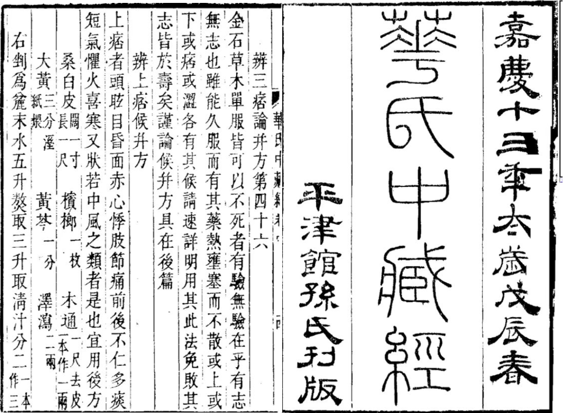 《华氏中藏经》较早地将脏腑学说的理论系统化,提出了以形色脉证相结合、以脉证为中心分述五脏六腑寒热虚实的辨证方法。在中国医学史上占有重要地位。全书前半部属基础理论范畴,后半部为临床证治内容(以内科杂病为主)。医论部分共49篇,联系脏腑生成和病理以分析证候和脉象,并论各个脏腑的虚实寒热,生死逆顺之法。所述病证包括阴厥、劳伤、中风偏枯、脚弱、水肿、痹证、痞证、症瘕积聚等内容。涉及槟榔的济方有三方,并附一方,即: