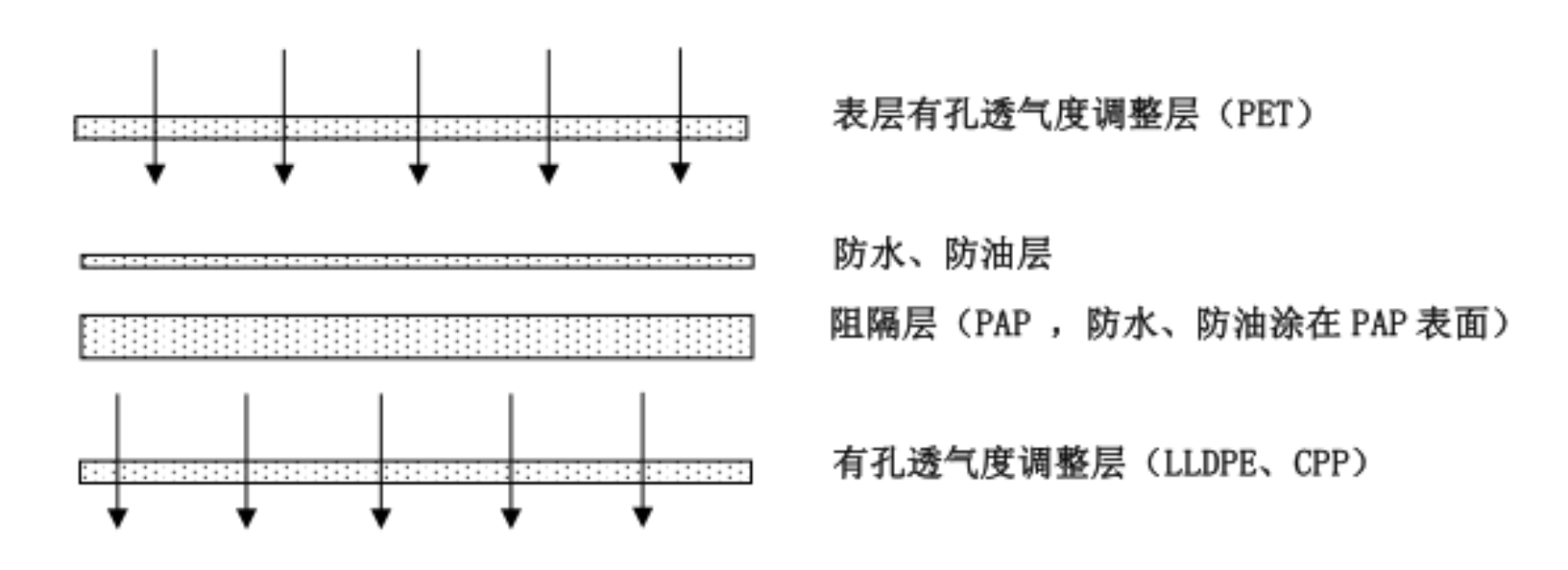 2010年,食品用脱氧剂包装卷膜生产厂家研发出具有防漏粉防水防油特性的三防复合膜。2014年,槟榔行业开始使用三防膜技术的脱氧剂,降低了安全隐患及危害,并获得多项专利,如《一种高透气型脱氧剂包装材料》(专利号ZL201720777571.5),《一种抗锈斑防水防油透气膜及脱氧剂包装袋》(专利号ZL202020414000.7)。原理是采用“PET/纸/PE三层膜”结构(见图1):PET外层膜上印刷文字并密集扎孔;中间纸层为功能作用层,不扎孔,具有三防特性,可以透过氧气,使之与脱氧剂内容物还原铁粉反应掉,维持食品包装中的绝氧状况,阻断脱氧剂内容物漏出污染食品;PE内层膜上为热封层,也密集扎孔。