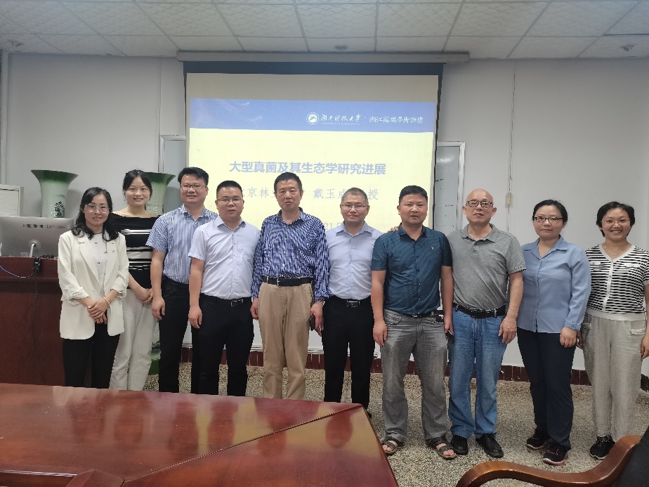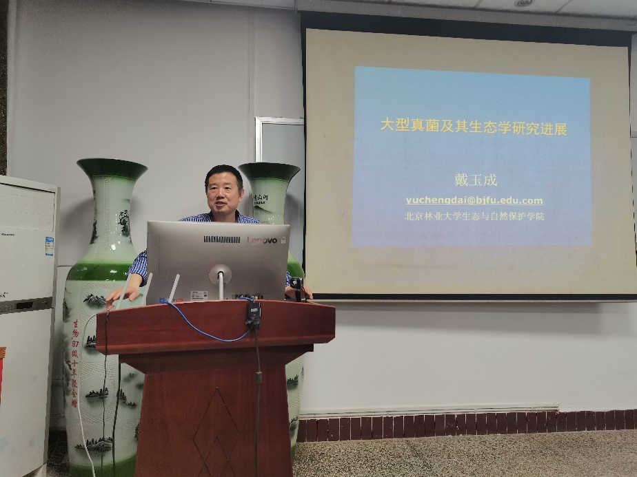 报告会上,戴玉成教授以真菌和动、植物的亲缘关系作为开场,生动有趣地介绍了蜜环菌、巨型马勃、香味全缘孔菌、火木层孔菌和鬼笔鹅膏等大型真菌的形态、特性与生活习性,展示了大型真菌菌物的分类和分子系统学研究方法,并对中国常见的食用菌、药用菌及木材腐朽菌的相关研究进行了阐述。