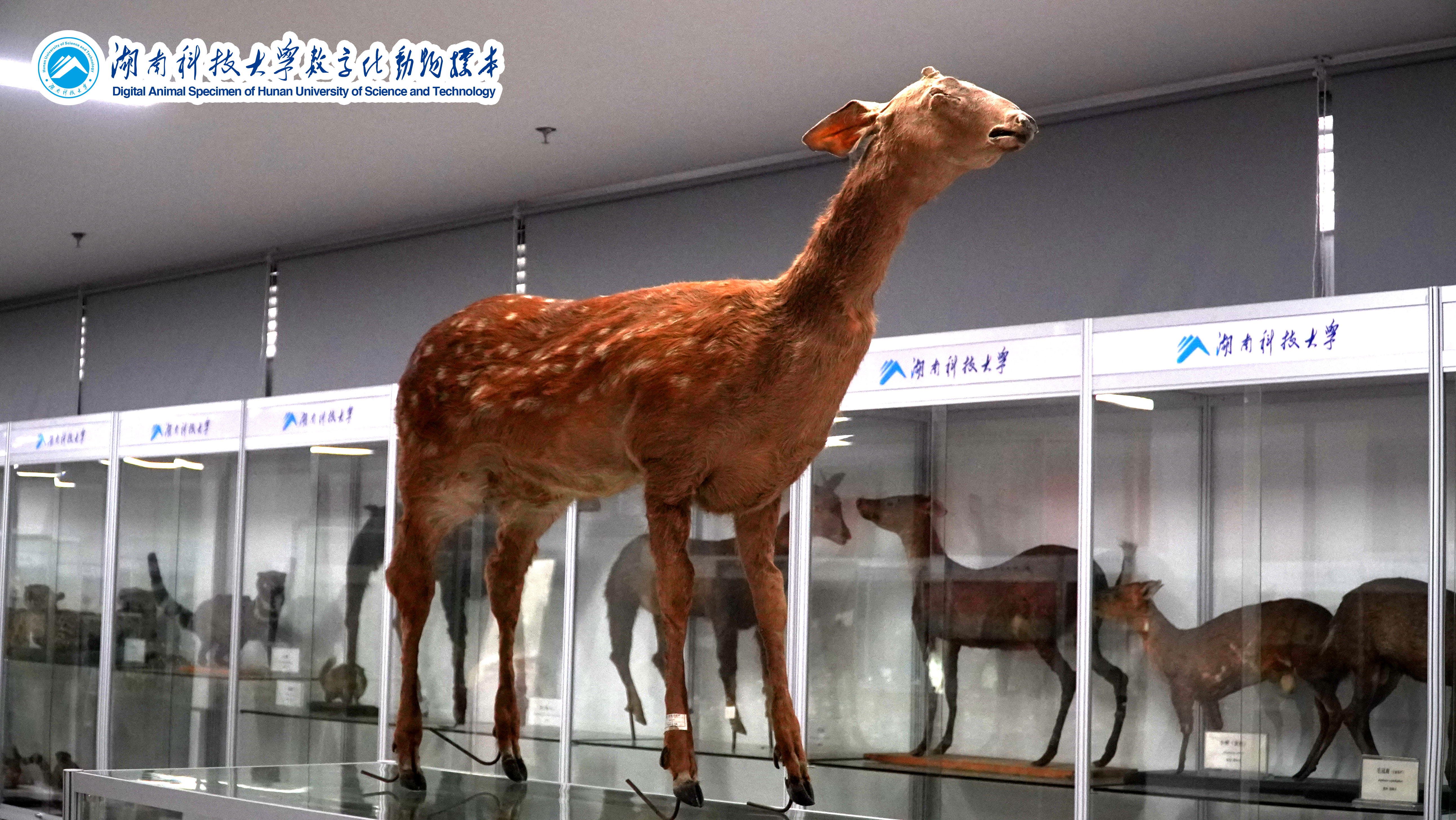 梅花鹿(Cervus nippon):隶属于哺乳纲偶蹄目、鹿科,国家一级保护动物。体长125至145厘米,尾长12至13厘米,肩高70至95厘米,体重70至100千克。毛色夏季为栗红色,有许多白斑,状似梅花;冬季为烟褐色,白斑不显著。颈部有鬣毛,雄性角长达30至66厘米。梅花鹿群居性不强,雄鹿往往是独自生活,活动时间集中在早晨和黄昏,生活区域随着季节的变化而改变。采食栎、板栗、胡枝子、野山楂、地榆等乔木和灌木的嫩枝叶以及刚刚萌发的草本植物。种群主要分布在俄罗斯东部、日本和中国。梅花鹿具有非常高的经济价值,它的全身都是宝,例如鹿茸、鹿血及各种内脏等,都具有极高的药用价值。该标本从人工饲养者手里购得并制作而成。