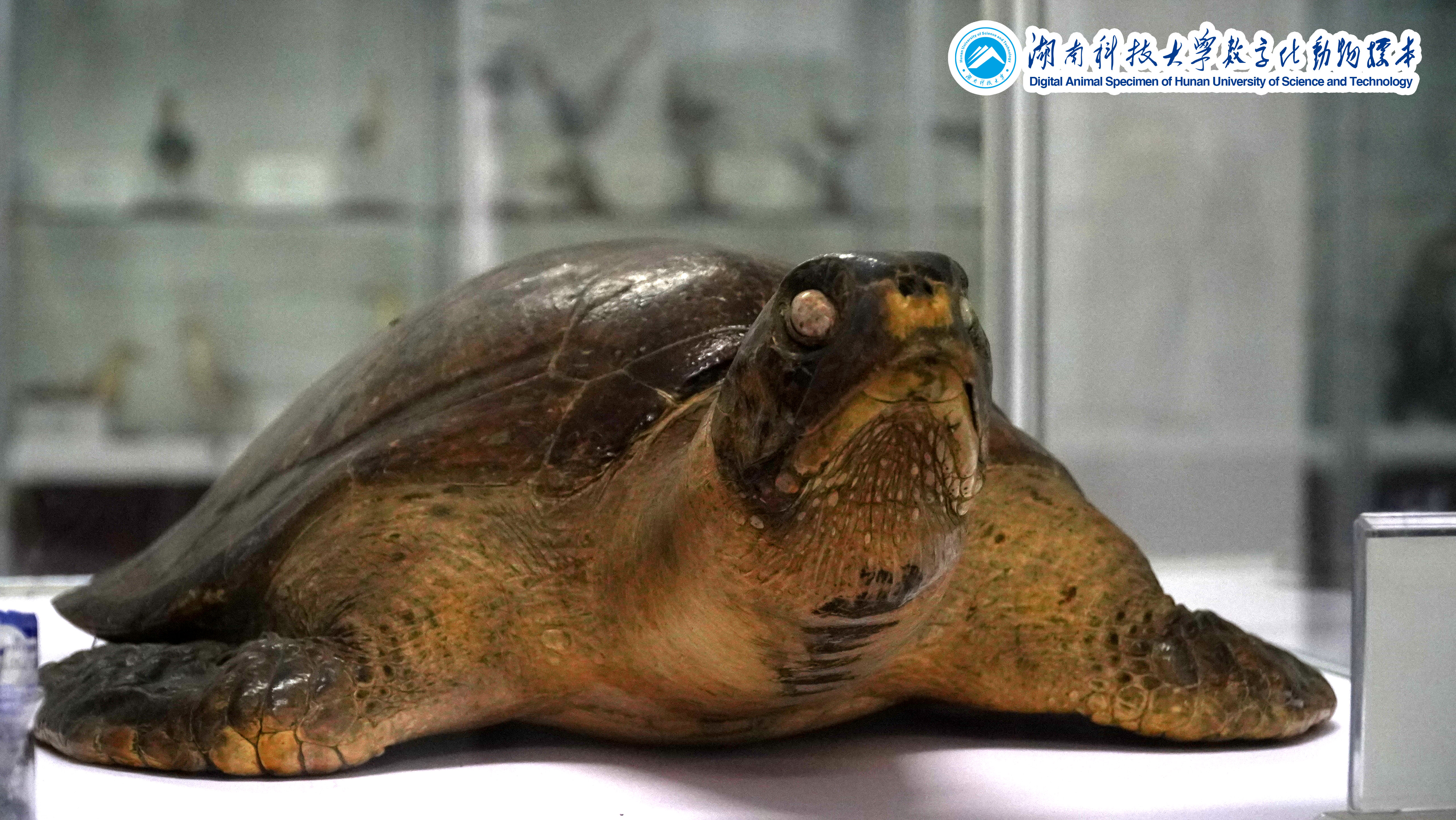 绿海龟(Chelonia mydas):隶属于爬行纲龟鳖目、海龟科,世界濒危保护动物,国家二级保护动物。亦称海龟,是各种海龟中体形较大的一种,其成龟背甲直线长度可达90到120厘米,体重可达100千克以上。因其体内脂富含主要食物,即海草之叶绿素而得名。然而,它的腹甲为白色或黄白色,背甲则从赤棕含有亮丽的大花斑到墨色不等。识别法为背甲中央为五盾,左右列各为四盾,眼睛上方具鳞片一对,绿海龟俗称黑龟或石龟,可能与耳身躯远望过去像个大黑圆石有关。绿海龟和其他海龟一样,除了上岸产卵外,终其一生都在大洋中渡过。广泛分布于太平洋、印度洋及大西洋温水水域。该标本的获取可谓奇巧,1990年代学校组织老师去井冈山参观学习时从民间艺人手里购得此龟,然后制作而成。