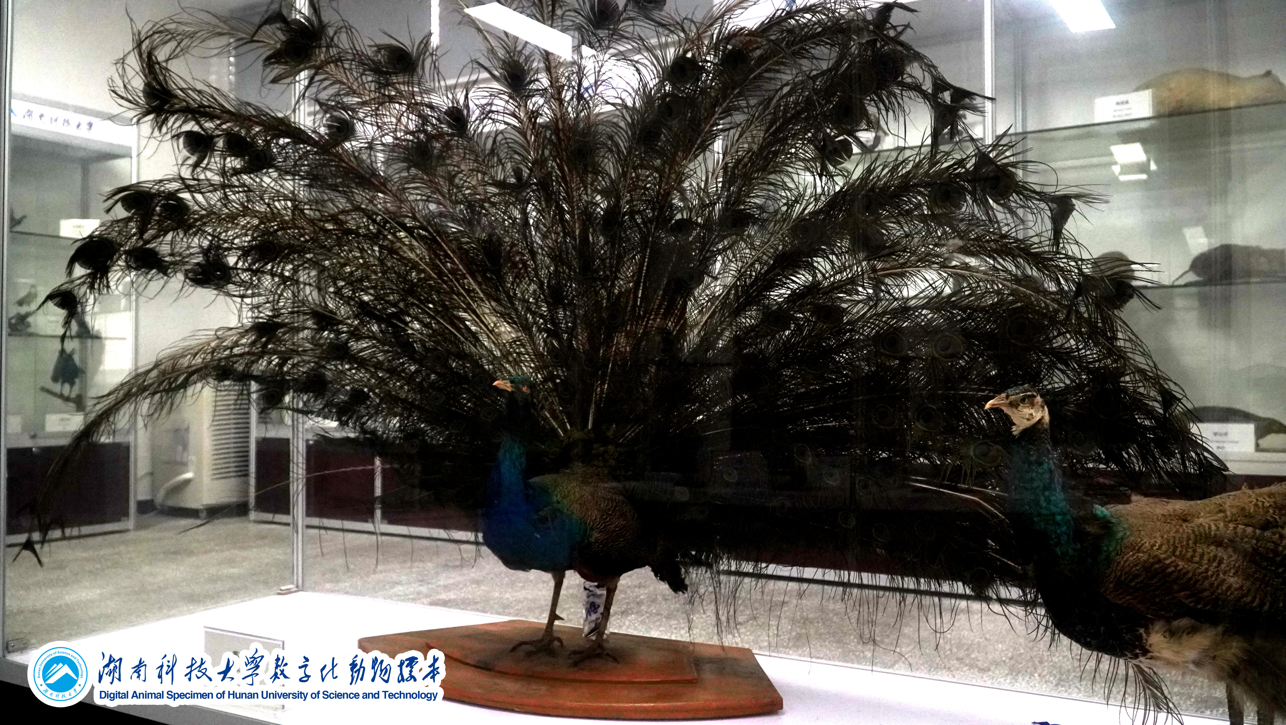 蓝孔雀(Pavo cristatus):隶属于鸟纲鸡形目、雉科,世界濒危保护动物。体长90-230厘米,翼展130-160厘米,体重3-6千克。雄鸟具直立的冠羽,头顶、颈部和胸部呈蓝色,羽色华丽;尾上覆羽特别延长,可形成尾屏;尾下覆羽为绒羽状;两翅稍圆;跗蹠长而强,具距。雌鸟头上也具冠羽,头顶、颈的上部呈栗褐色;尾上覆羽延长不明显,不形成尾屏。蓝孔雀主要生活在丘陵的森林、干燥的半沙漠化草地、灌木和落叶林地区,尤其在水域附近。因其长的美丽,故受到很多人的喜爱。主要分布于孟加拉国、不丹、印度、尼泊尔、巴基斯坦和斯里兰卡。该鸟有较高的药用价值,世界多地均有饲养,是印度的国鸟,也是伊朗两种国鸟之一。该标本来自湘潭动物园,因衰老死亡后制作成标本。