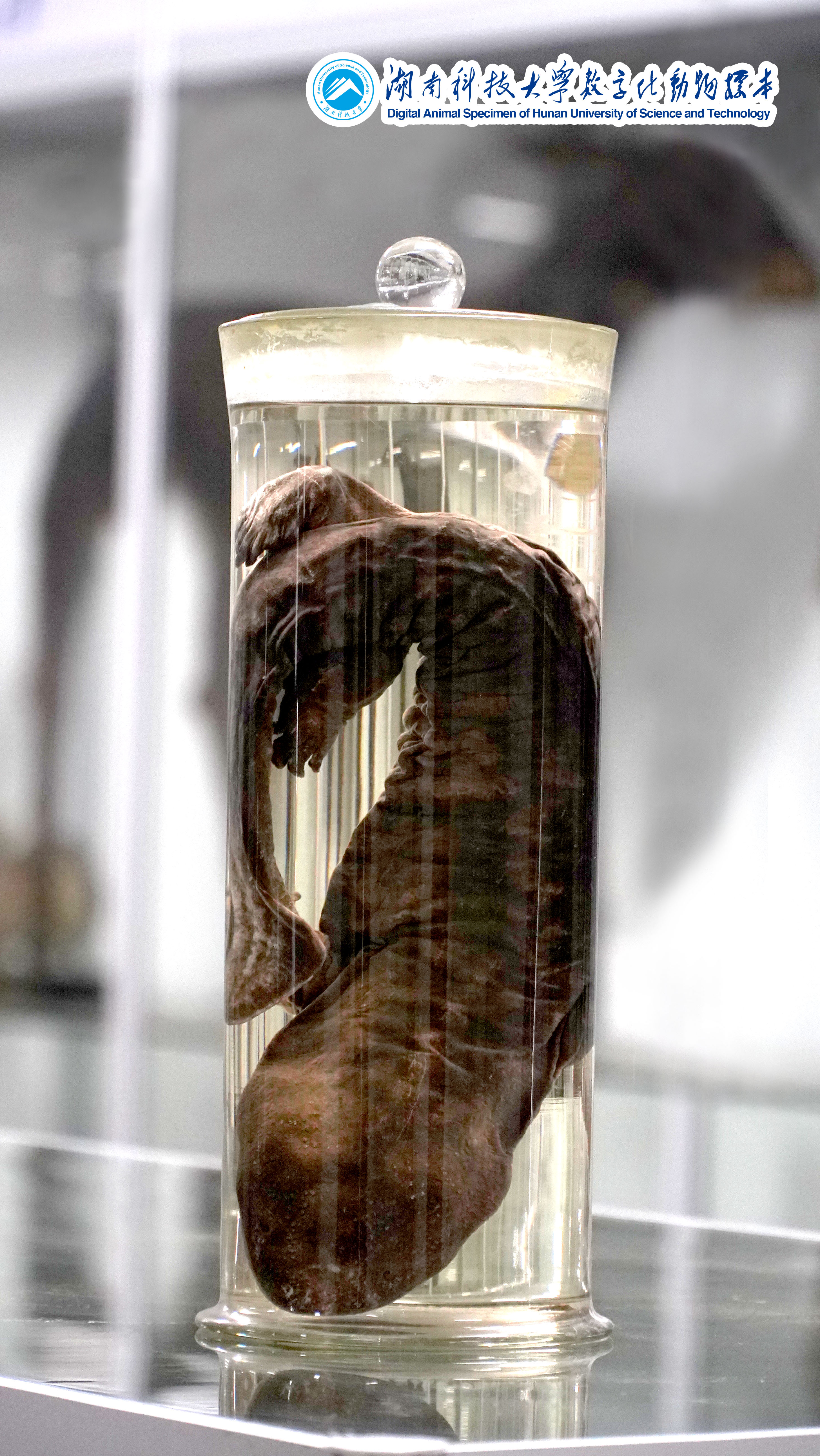 大鲵(Andrias davidianus):隶属于两栖纲有尾目、隐腮鲵科,国家二级保护动物。体大而扁平,一般全长582~834毫米,头体长310~585毫米,最大个体全长可达200厘米以上。头大扁平而宽阔,头长略大于头宽;雄鲵肛部隆起,椭圆形,肛孔较大,内壁有乳白色小颗粒;雌鲵肛部无隆起,泄殖肛孔较小,周围向内凹入,孔内壁平滑,无乳白色小颗粒。成鲵一般常栖息在海拔1000米以下的溪河深潭内的岩洞、石穴之中,以滩口上下的洞穴内较为常见;食性很广,主要以蟹、蛙、鱼、虾以及水生昆虫,及其幼虫等为食。主要分布于中国河北、云南、湖南等地。大鲵肉食用课以强壮体质,能有效地防治贫血、月经失调等症;大鲵的皮厚实坚韧,可以用以制革;还可制成治疗灼伤的药物;也可治疗小儿嗝食之类的胃病;胆汁能解热明目。该标本于20世纪80年代通过正规途径购得。