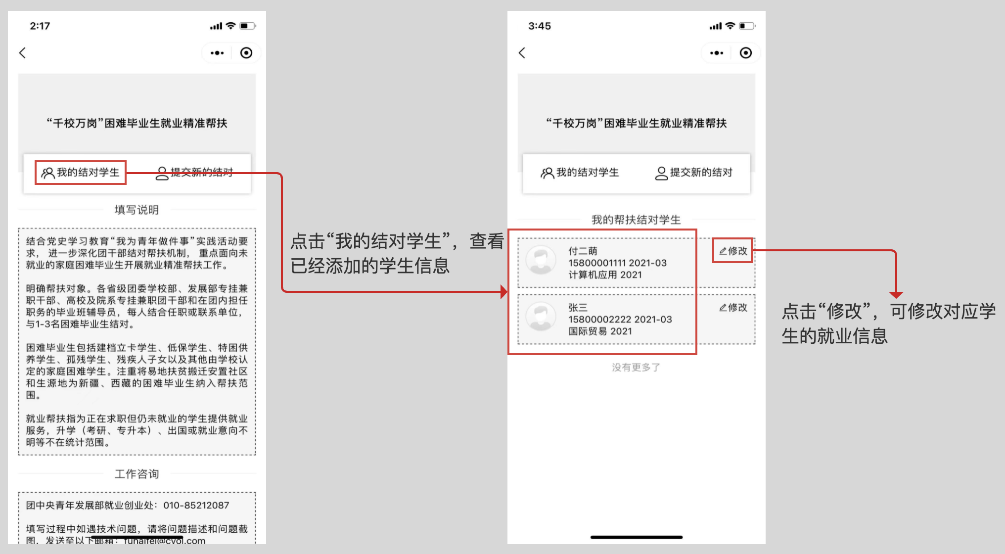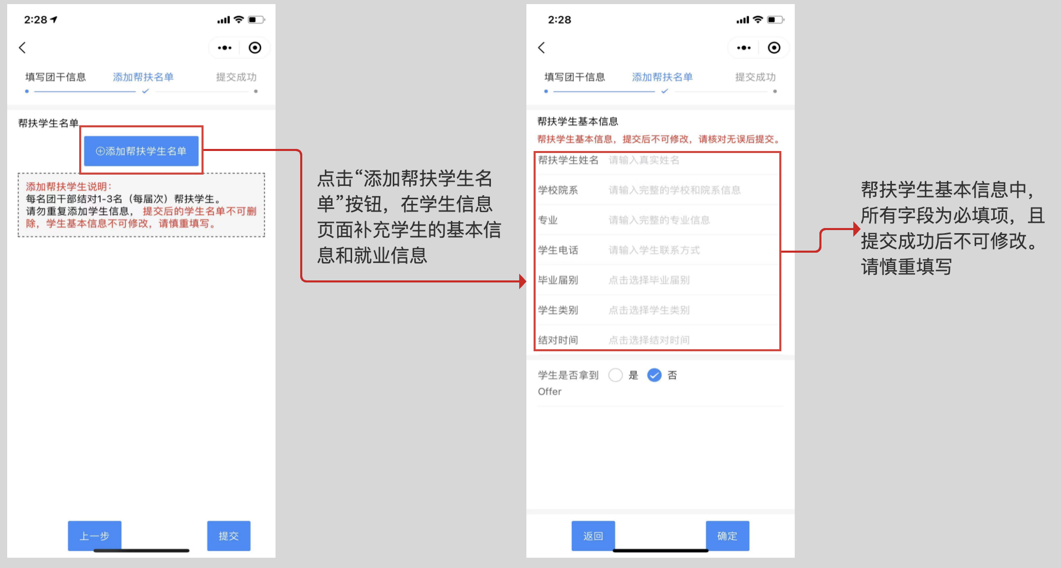 由于结对帮扶工作已经在线下开展了一段时间,技术已经将线下整理的结对名单,提前导入到数据库中,并匹配团干手机号码,将手机号码下的结对数据,自动关联到团干账户下。团干可查看已经导入并关联的学生信息,并修正填报时的错误字段。