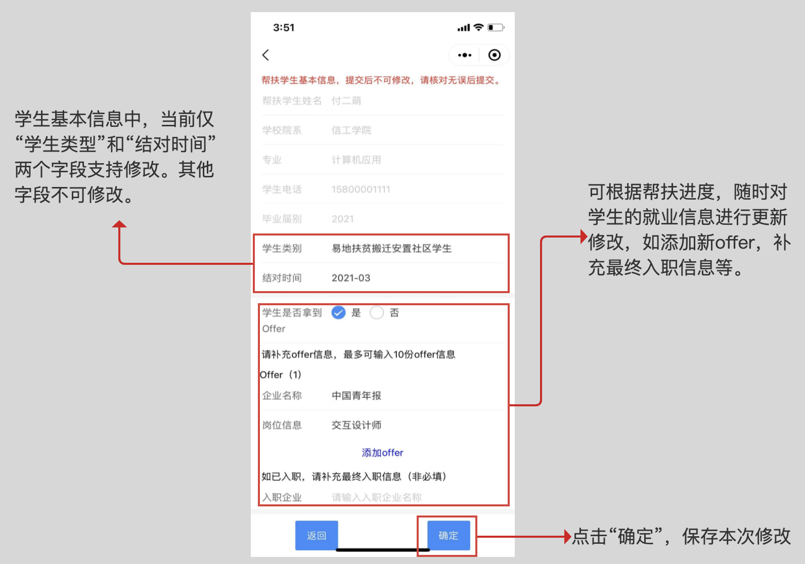 在学生的就业信息修改页面,团干可根据帮扶进度,随时更新学生的就业信息,如补充新拿到的offer信息,填写学生的最终入职信息等。学生的基本信息中,当前仅“学生类型”和“结对时间”两个字段支持修改,其他字段不可修改。(后期基本信息的所有字段将升级为不可改)