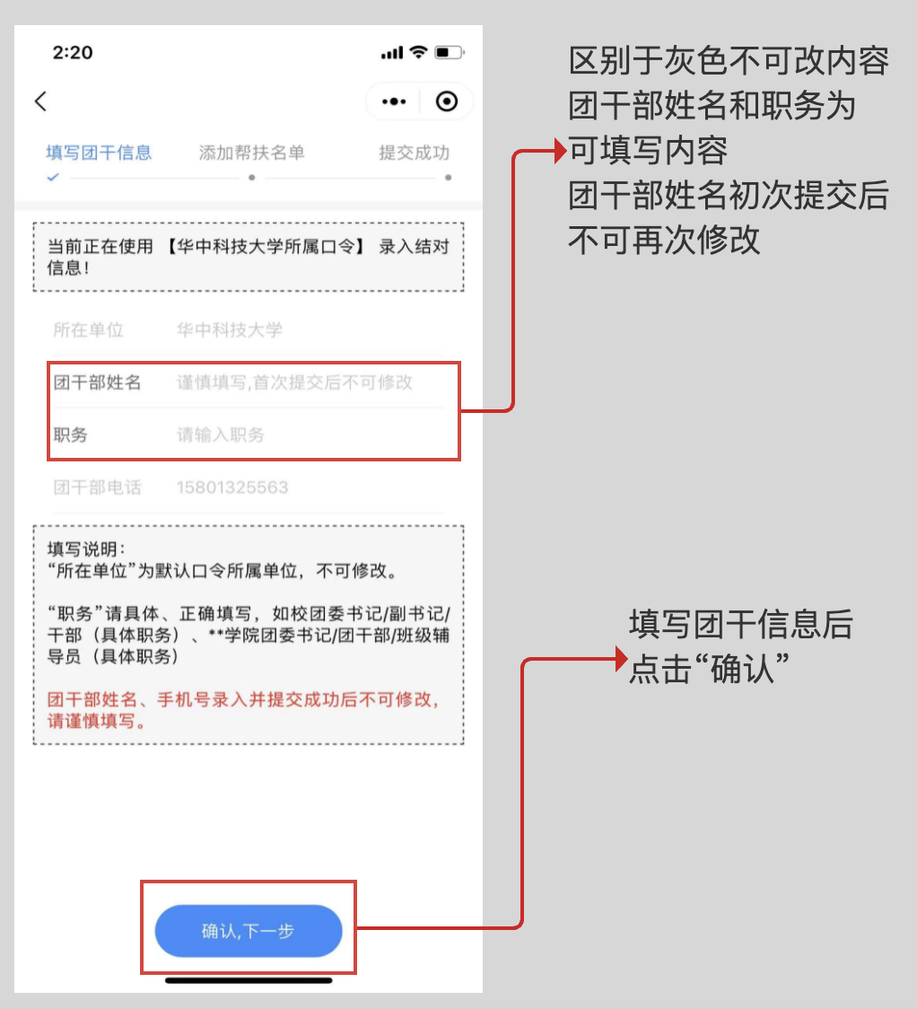 在填写团干信息页面中,仔细阅读填写说明,正确输入团干部姓名、职务等信息,填写完成后点击“确认,下一步”按钮,可跳转到添加结对名单页面。(“所在单位”为口令所属单位,不可修改,团干部电话为登录注册对应的手机号码,不可修改)此页面中的团干部姓名务必填写正确后提交,首次提交成功后,该字段将自动变为不可修改项。