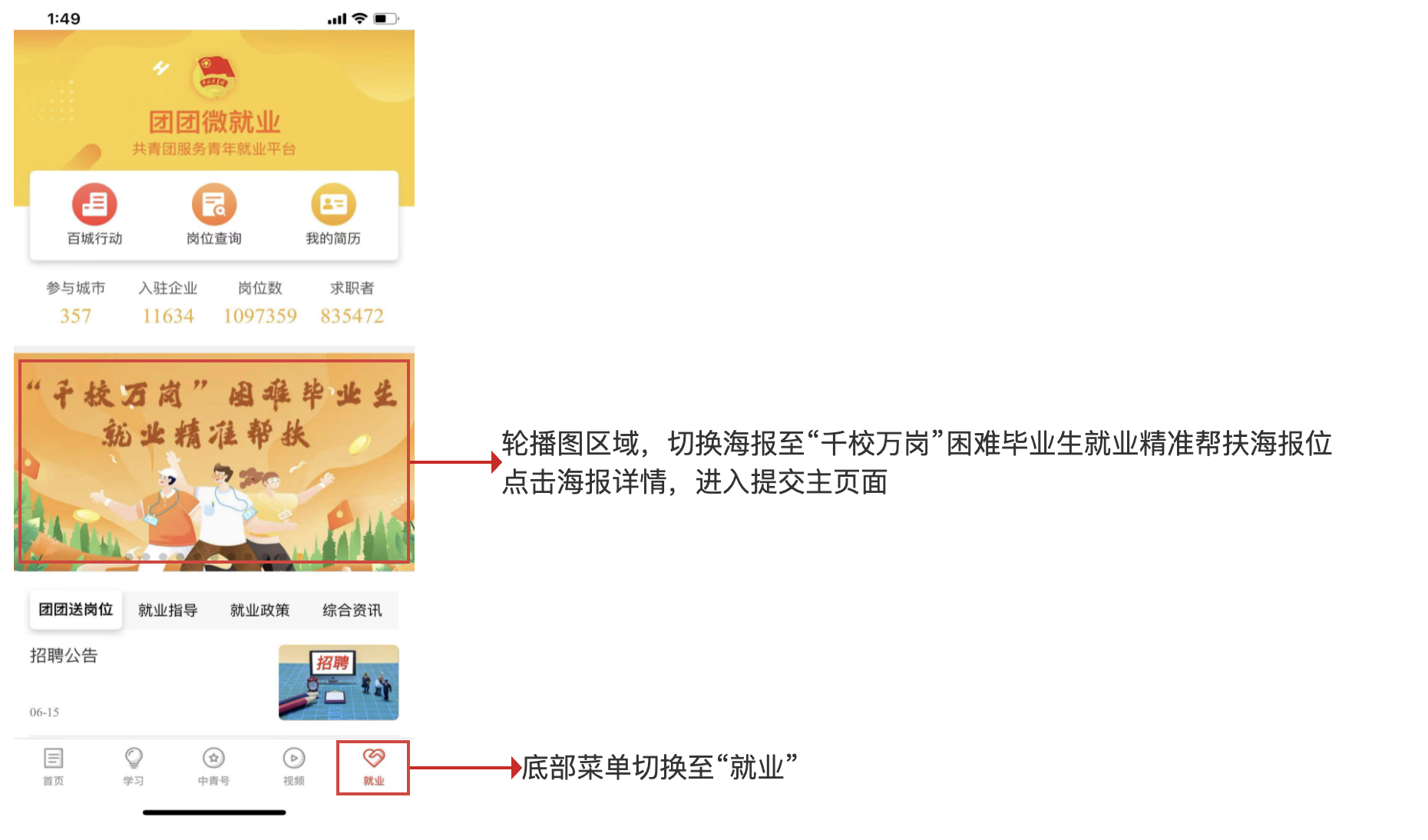 底部的菜单项,点击“就业”切换至“就业”板块;