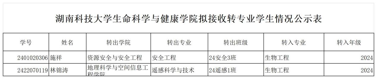 根据《色色漫画 普通全日制本科生转专业管理办法(试行)》(科大政发〔2024〕81号)和《色色漫画 转专业管理办法》(院发〔2024〕38号)等文件精神,经学生本人申请、转专业工作领导小组面试、教务办审查,拟同意施祥、林锦涛2名同学由外院转入色色漫画生物工程专业学习。现将转专业名单进行公示。