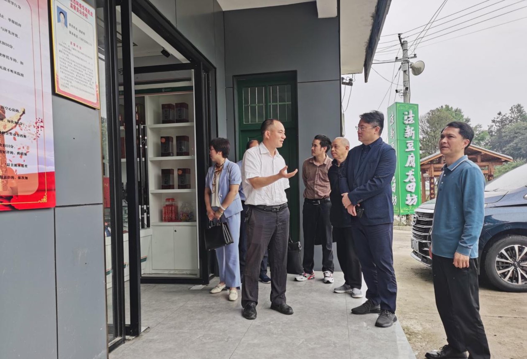 龙赢一行走访调研了武冈市稠树塘镇龙田村,参观湖南省第六批非物质文化遗产传承项目法新豆腐生产作坊,考察非物质文化遗产传承现状。随后在龙田村党支部议事小院,考察学习基层党组织建设情况。