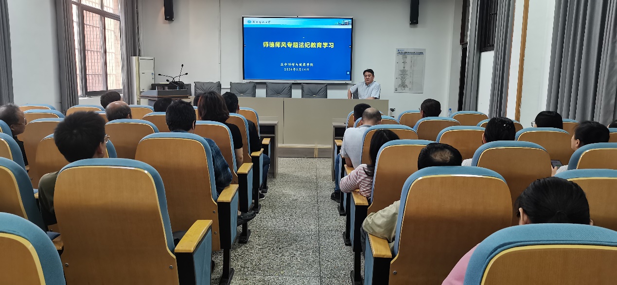首先,龙赢带领大家学习相关政策法规,重点围绕教育家精神和《教师法》《教师资格条例》 《新时代高校教师职业行为十项准则》等政策法规进行系统学习,随后通过典型案例进行警示教育学习。龙赢指出,要进行对照反思,查摆在日常教育管理、纪法知识学习、相关制度执行等方面存在的突出问题,查摆在课堂教学、关爱学生、师生关系、学术研究、社会活动等方面的短板差距,严守教师底线,规范执业行为。