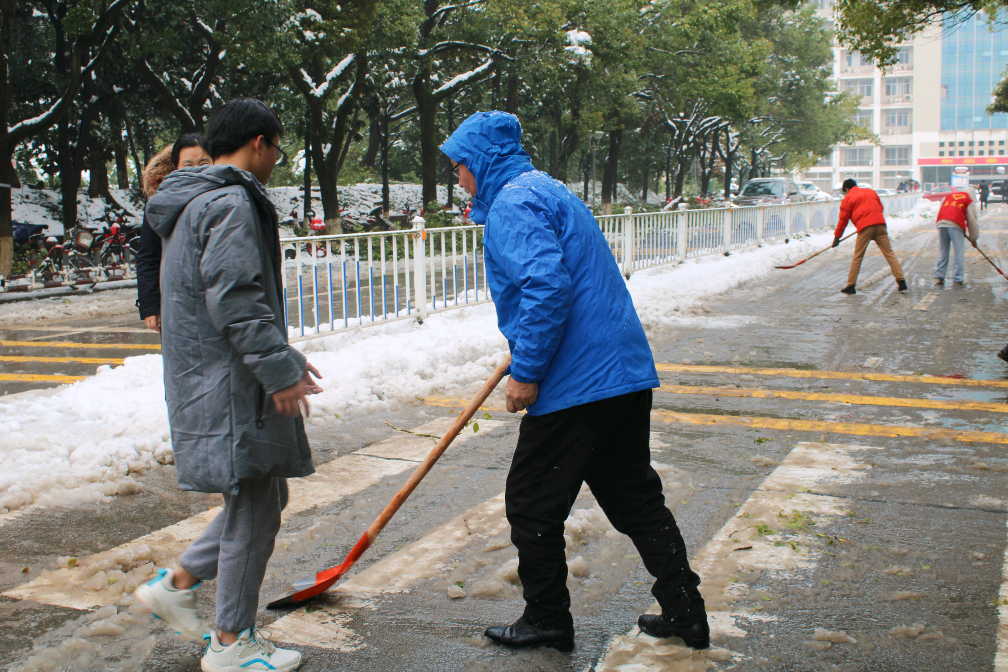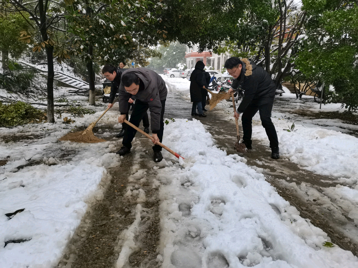 他们有的挥舞铁锹、撮箕,铲冰除雪,有的手拿扫帚,清扫路面,经过两个多小时的奋力打扫,我校明湖路、生科楼前、家属区路段的积雪得到清除,及时保证了北门周边道路的安全畅通,为师生的安全出行带来了保障。