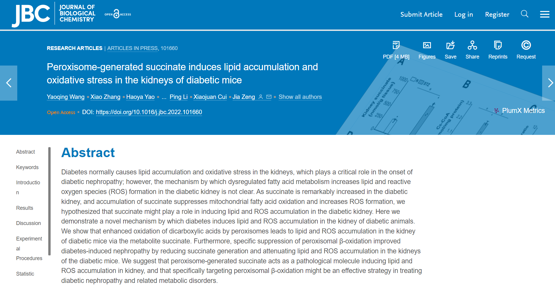 课题组以链脲佐菌素(STZ)诱导糖尿病小鼠为模型动物,以自行开发的高特异性小分子抑制剂TDYA和特异性脂肪酸代谢底物为主要研究工具,系统研究揭示了过氧化物酶体脂肪酸代谢促进糖尿病小鼠肝脏胆固醇生物合成并引起高胆固醇血症的分子机制,这是国际上首次完整报道过氧化物酶体脂肪酸氧化体系促进胆固醇生物合成的生理及病理特性,从全新的角度阐述了糖尿病如何引起血脂异常的分子机制。课题组同时研究了过氧化物酶体与糖尿病肾病的关联机制,揭示了过氧化物酶体二羧酸代谢产生的琥珀酸(Succinate)作为核心致病分子抑制糖尿病小鼠肾脏线粒体脂代谢并产生大量活性氧自由基(ROS),进而引起肾脏脂质和氧自由基大量积累并最终引起肾小球病变,同时产生的过量琥珀酸还可以通过激活肾素-血管紧张素-醛固酮系统(RAAS)系统,引发血压异常升高。糖尿病并发症发生的分子机制是目前国际基础医学领域的研究热点,上述病理机制的发现为深入了解糖尿病如何引起糖脂代谢紊乱及并发症的发生提供了新的思路和方向,同时为糖尿病治疗新型药物的开发提供了潜在的蛋白靶点和验证化合物。