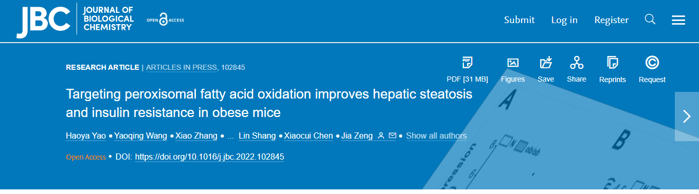 课题组以瘦素基因突变肥胖小鼠(ob/ob)为模型动物,以高特异性小分子抑制剂TDYA和特异性脂肪酸代谢底物为主要研究工具,通过生物化学、分子生物学以及动物生理学等系列实验,揭示了过氧化物酶体脂肪酸代谢系统异常升高是引起肝脏脂肪积累的关键决定因素,其通过不断积累的代谢产物乙酰辅酶A(acetyl-CoA) 和过氧化氢(H2O2)反馈性抑制线粒体脂肪酸β-氧化,进而引起肝脏脂肪和活性氧自由基(ROS)大量积累,最终引发脂肪肝和肝损伤以及胰岛素抵抗,该项研究从全新的角度阐述了肥胖及脂肪酸摄入过量如何引起肝脏线粒体脂代谢下调以及脂肪积累的分子机制。