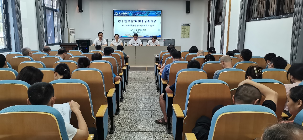 龙赢同志首先向全院教职工通报了2023年学习贯彻习近平新时代中国特色社会主义思想主题教育民主生活会的开展及整改情况。各分管院领导通报了暑期开展的各项工作和新学期的工作设想。龙赢同志最后强调从严治党、清廉校园建设、立德树人、学科特色凝练等方面工作,并部署了八项专题工作。