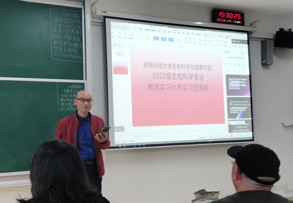 2025年12月11日14:00,2022级生物科学专业教育实习总结大会于知行楼B209教室准时召开。生物科学系系主任唐新科、各实习队指导教师及全体2022级生物科学专业学生参会,共同回顾为期10周的教育实践历程,总结成长收获,表彰先进典型。会议由唐新科主任主持。